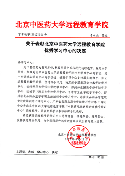 | 近日,北京中医药大学远程教育学院发文《关于表彰北京中医药大学远程教育学院优秀学习中心的决定》(京中远字〔2012〕001号),对在2011年度中医药现代远程教育工作中取得优异成绩的学习中心进行表彰,必赢76net线路官网获得2011年度优秀学习中心荣誉称号。 2011年,必赢76net线路官网全体工作人员通过不懈努力,在招生、管理、考试等环节都取得了显著成绩,招生数量稳步提高,管理服务日趋到位,课程考试严格规范,保证了教学质量。在北京中医药大学远程教育学院组织的测评中,学员对我学习中心各项工作表示满意,满意率在全国27个学习中心中名列前茅,受到北京中医药大学远程教育学院的表彰,为学院赢得了荣誉。