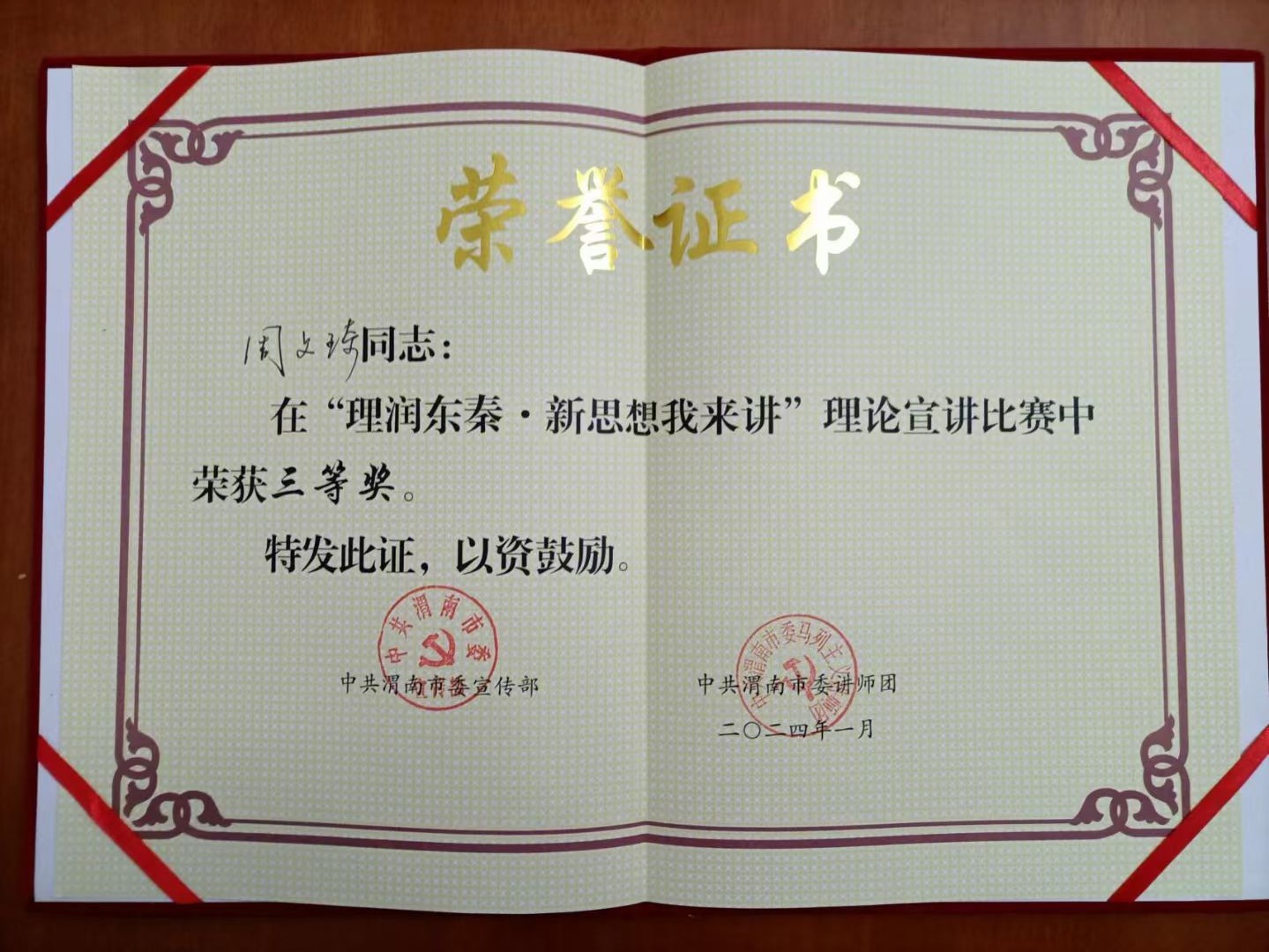 1月25日下午,由市委宣传部主办,市委讲师团、“学习强国”渭南学习平台、市东雷二期抽黄工程管理中心承办的“理润东秦·新思想我来讲”理论宣讲比赛在我市举行。必赢官网周文琦同志参赛,并荣获三等奖。