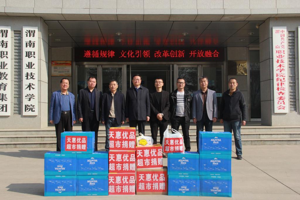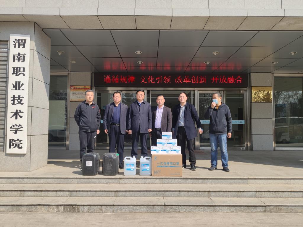 “同舟共济度时艰,众志成城战疫情。”3月23日上午,两家爱心企业带着浓浓的爱心来到学校,为必赢官网捐赠大批防疫物资,助力学校疫情防控工作。渭南天惠优品超市经理袁新一行四人,给学校捐赠了500个医用一次性口罩,医用红外额温计2支,120瓶84消毒液,30瓶医用酒精,240瓶矿泉水。西安食通餐饮管理有限公司总经理杨小红一行2人,为学校捐赠了600个一次性口罩,100升84消毒液,2桶医用酒精。