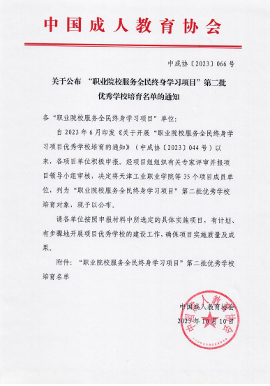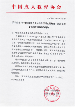 中国成人教育协会确定必赢官网为“职业院校服务全民终身学习项目”第二批实验校。学院成功入选“第二批职业院校服务全民终身学习项目”优秀学校培育名单。